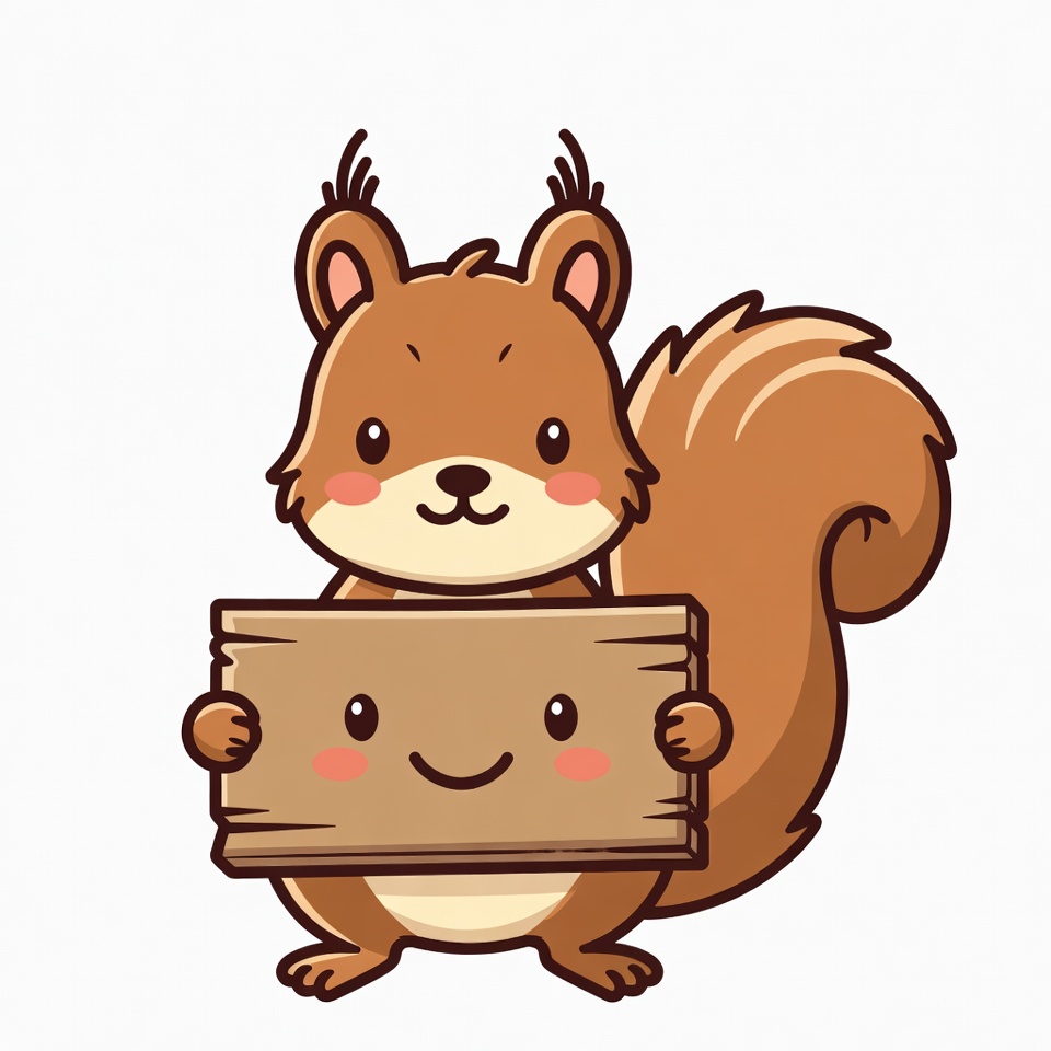 A kawaii cartoon squirrel with big eyes and fluffy tail holds a blank wooden sign in its paws. The squirrel has rosy cheeks and a cheerful smile, standing on a white background. The illustration features vibrant brown fur and cute facial expressions.
