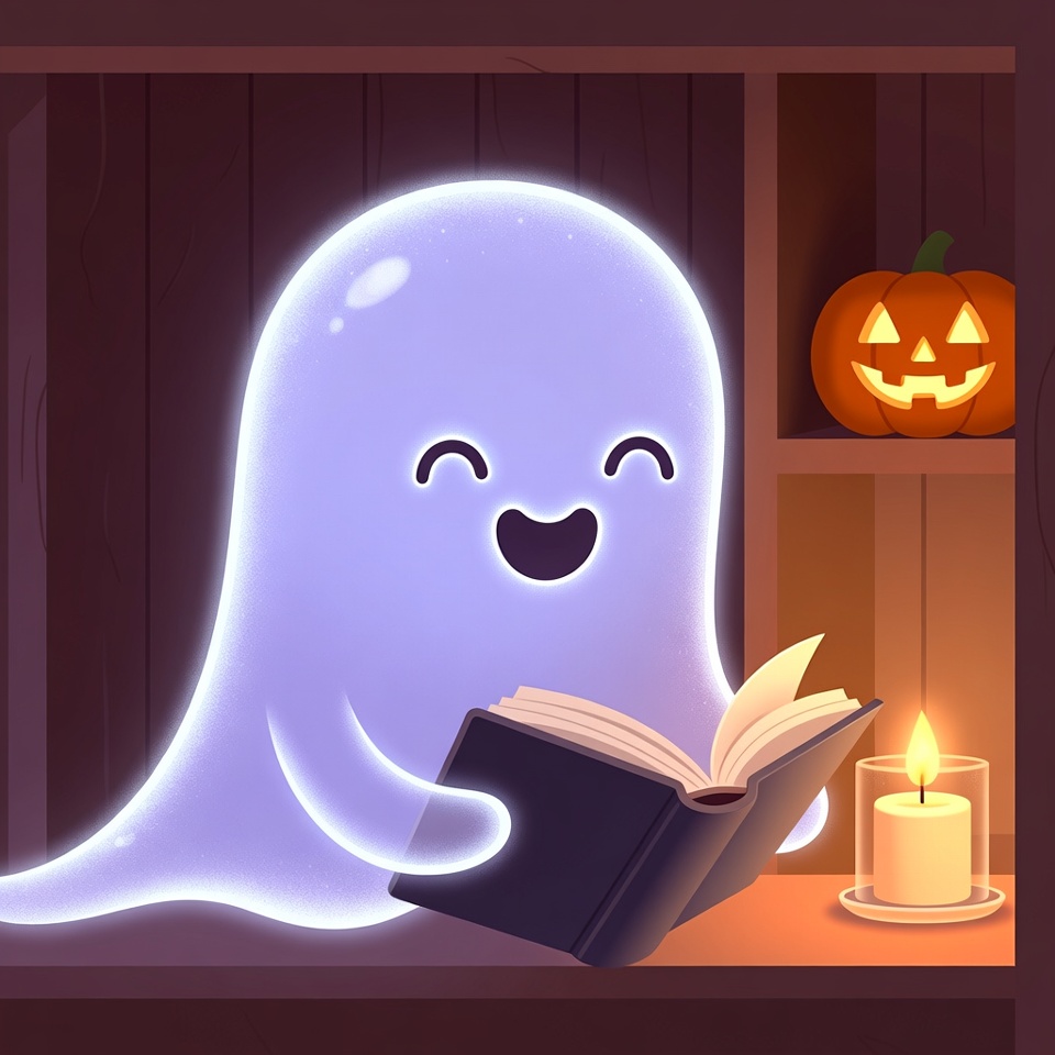 A cute cartoon ghost with a smiling face reads an open book on a wooden shelf. A carved pumpkin sits beside it, and a lit candle glows nearby. The scene features warm lighting and Halloween elements on an isolated background.
