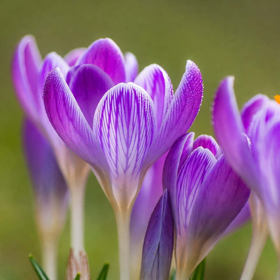 blooming crocus, closeup, crocus flowers, dewdrops, floral, flower cluster, flowers, garden flowers, grass, green background, nature, outdoor, petals, plant stems, purple crocus, purple flowers, spring flowers, white stems, white stripes, crocus