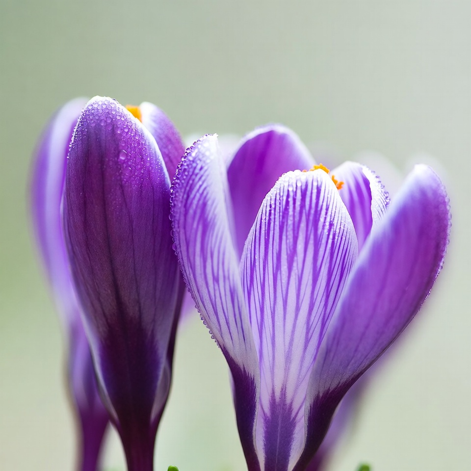 Close-up of several vibrant purple crocus flowers with white stripes and orange centers. Dew drops glisten on the petals against a soft green blurred background. The flowers stand upright with slender green stems.