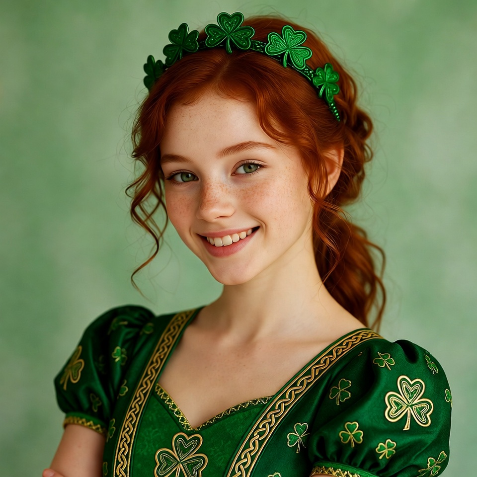 A young girl with long red hair and freckles smiles at the camera while wearing a green shamrock headband. She is dressed in a green velvet dress adorned with shamrocks and gold trim, posing with arms crossed. The background is a solid green color.