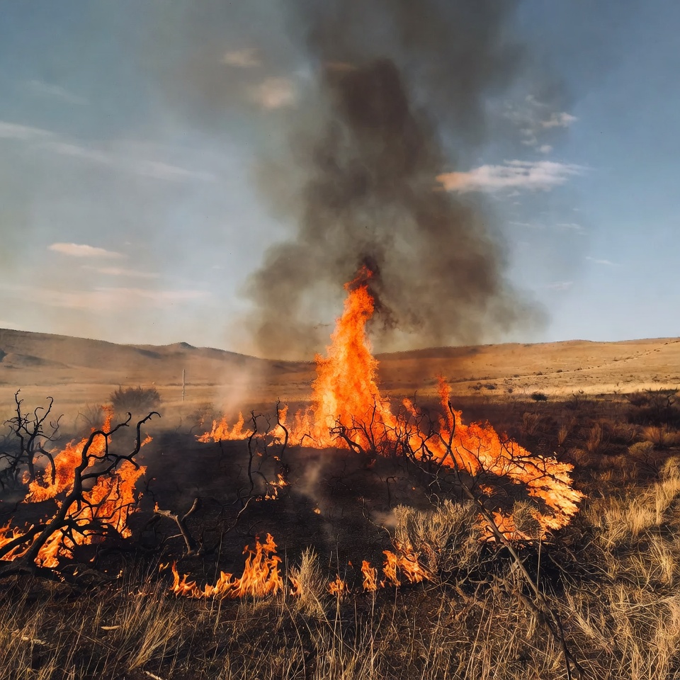arid terrain, barren hills, black smoke, burning, bushfire, camp fire, cloudy sky, dead trees, dry field, fire, flames, grassland, landscape, nature, orange flames, outdoors, prairie fire, smoke, sunset sky, wildfire, bonfire