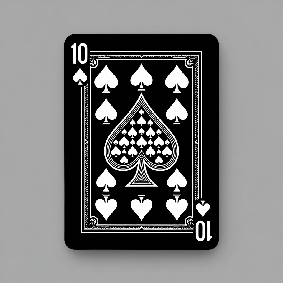A standard ten of spades playing card features a black background with white spade symbols. Ten small spades are arranged in a symmetrical pattern in the center, flanked by larger spades in the corners. The card has ornate white borders and '10' numerals in the top left and bottom right corners.