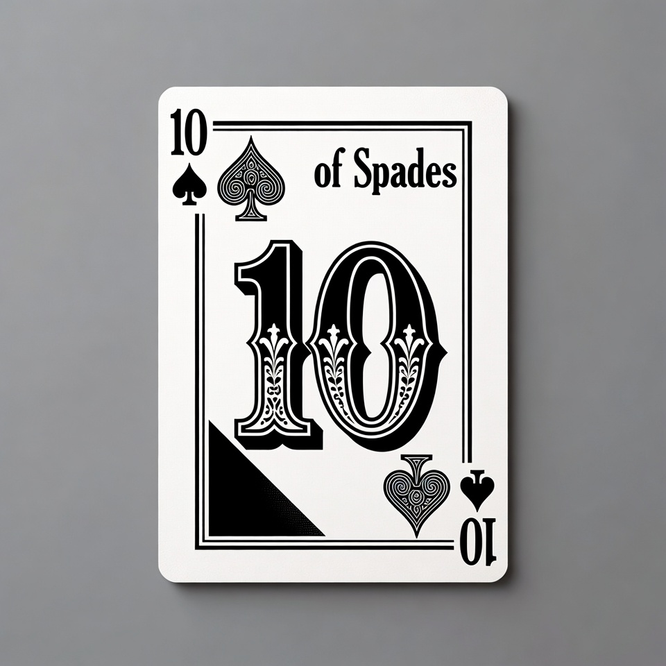 A standard 10 of Spades playing card features ten black spade symbols arranged across its face. The card has a white background with a black border and ornate numbering at the top and bottom corners. The large '10' numeral is prominently displayed in the center with decorative flourishes.