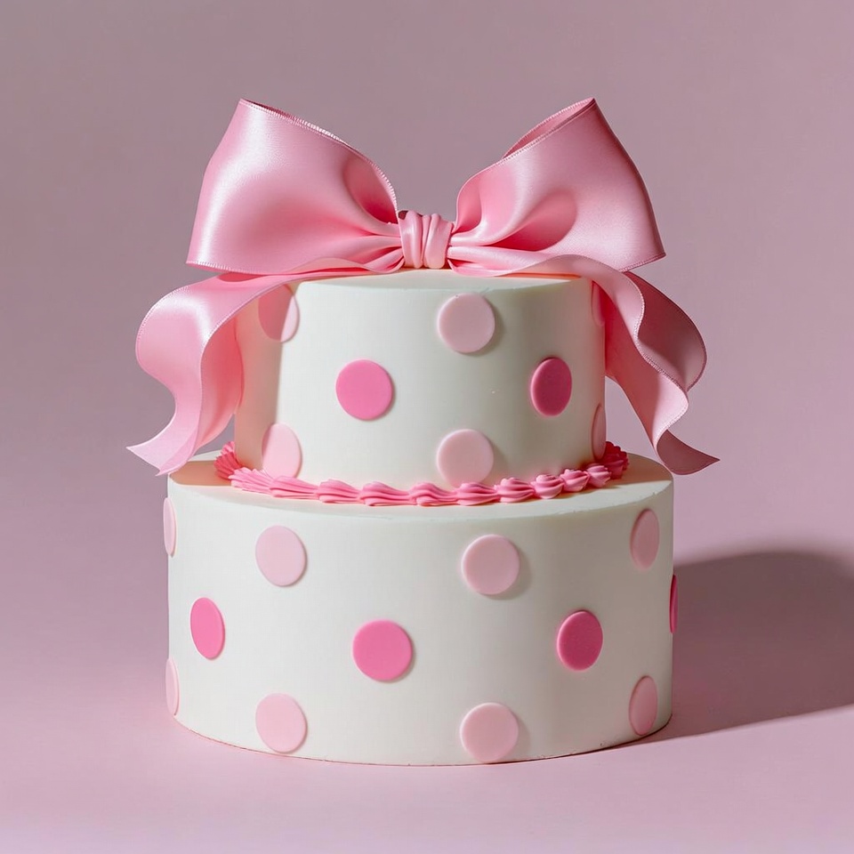 A two-tier white cake is decorated with pink polka dots and pink frosting. A large pink satin bow sits on top. The cake is displayed against a matching pink background.
