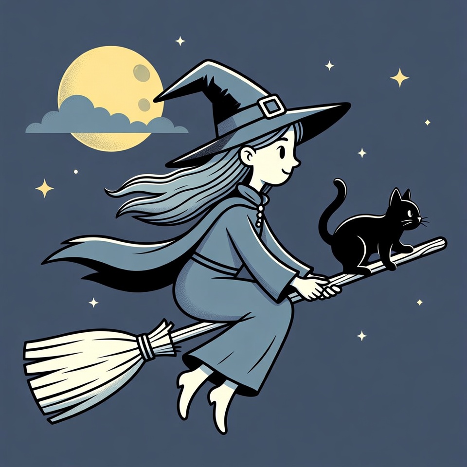 A cute cartoon girl with long blue hair and a tall hat flies on a broomstick under a full moon. She wears a flowing blue dress and holds a black cat on her broom. Stars and clouds fill the dark night sky.