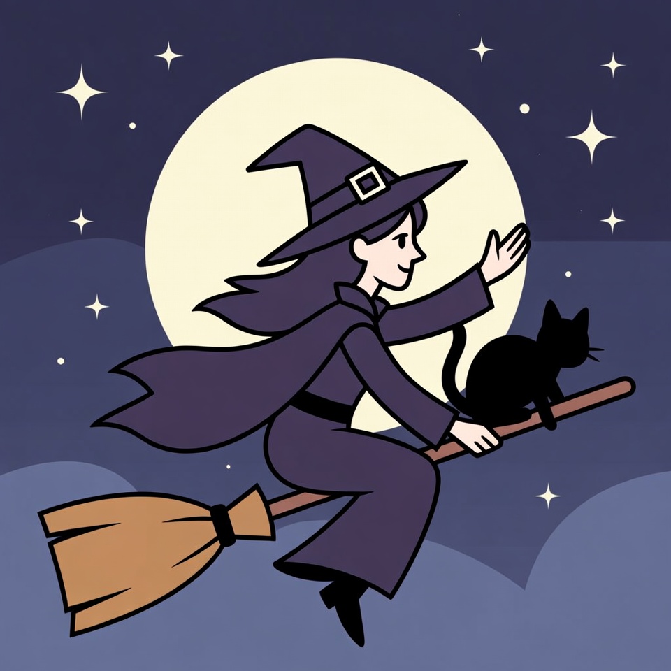 A cartoon witch with long purple hair and a pointed hat flies on a broomstick against a starry night sky with a full moon. She wears a flowing purple robe and holds the broom with one hand while raising the other. A black cat sits on her shoulder.