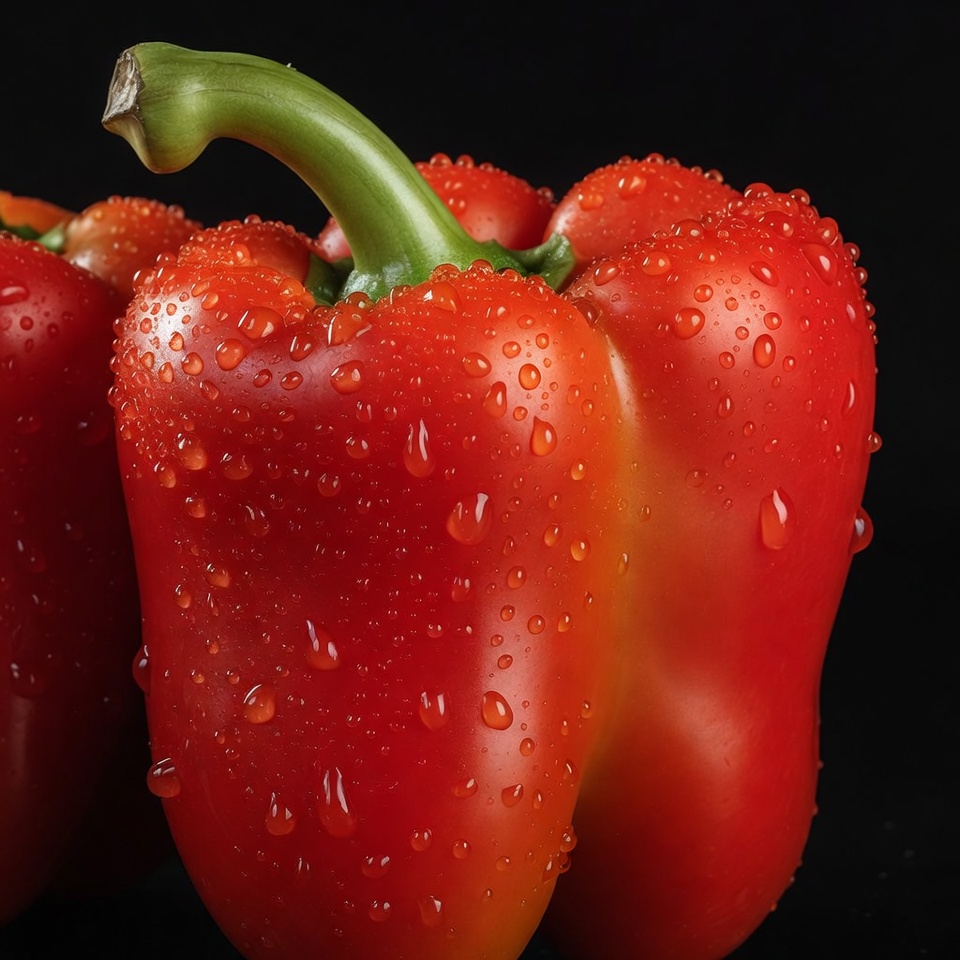 Several vibrant red bell peppers with green stems are clustered together on a black background. Water droplets glisten on their smooth, shiny surfaces. The peppers are fresh and dewy, prominently displayed in close-up view.