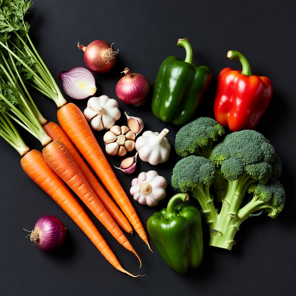 An assortment of fresh vegetables is arranged on a black background. Carrots, broccoli, bell peppers, onions, and garlic are prominently displayed with green parsley. The vegetables are whole and vibrant in color.