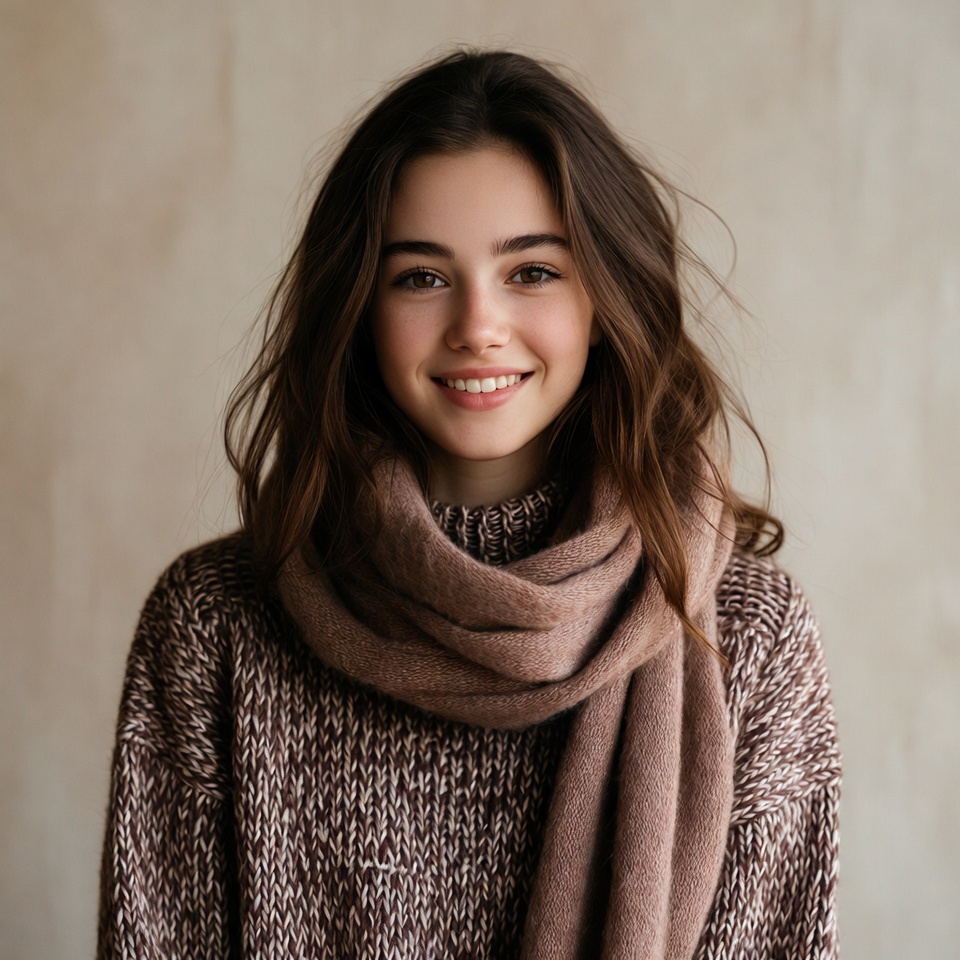 A young woman with long wavy brown hair smiles warmly at the camera. She wears a brown knit turtleneck sweater and a matching oversized scarf draped around her neck. She stands against a plain beige background.