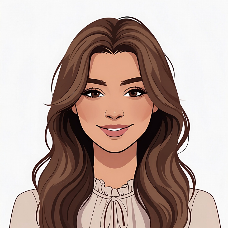avatar, beautiful woman, brown eyes, brown hair, collared shirt, digital art, female, headshot, illustration, isolated background, long hair, portrait, ruffled neckline, smiling, tan skin, wavy hair, white blouse, young woman, woman