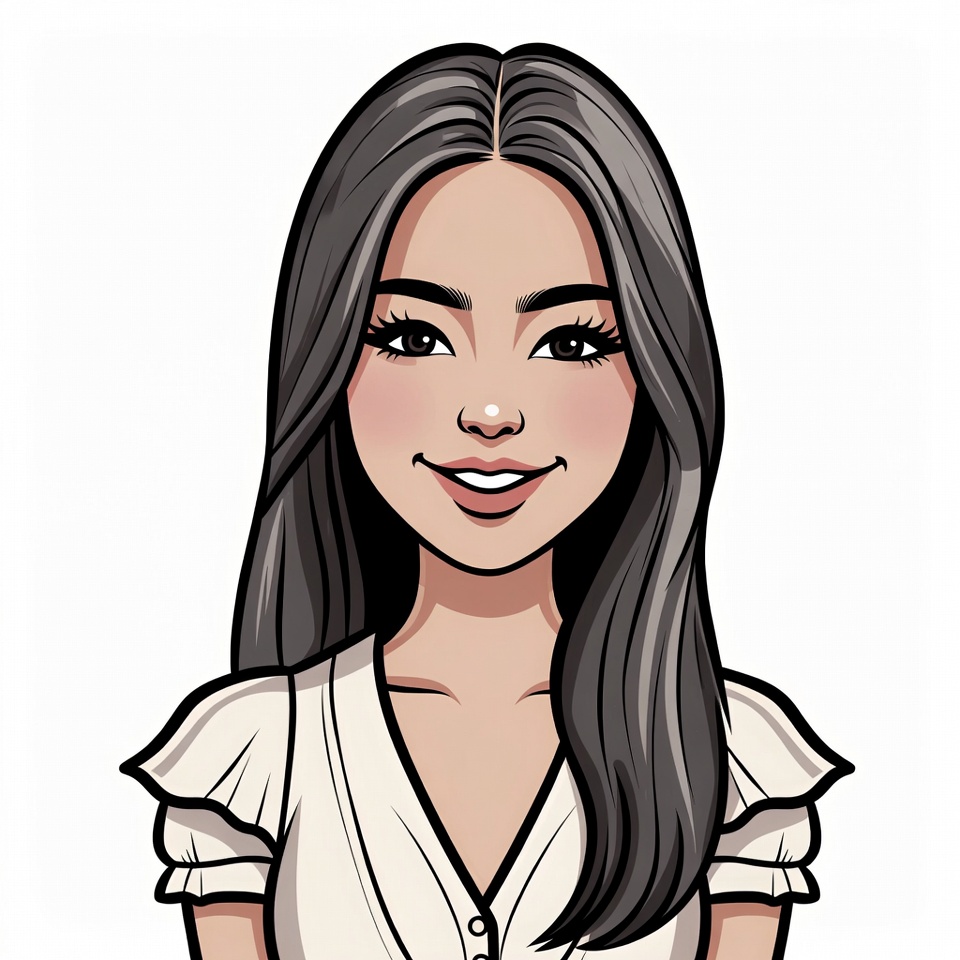 Asian, anime style, avatar, black hair, cartoon, clipart, female, happy face, illustration, isolated background, long hair, off-shoulder top, portrait, ruffled sleeves, smiling, vector art, white top, young woman, woman