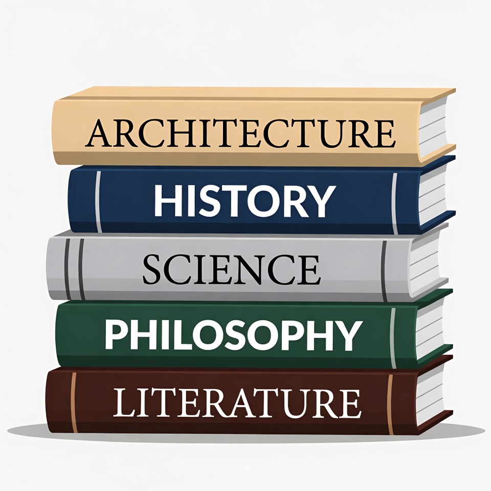 A clipart illustration shows a stack of five hardcover books on a white background. The books are labeled Architecture in tan, History in navy blue, Science in gray, Philosophy in green, and Literature in maroon. Each book features white text on its spine and is depicted in a simple vector style.
