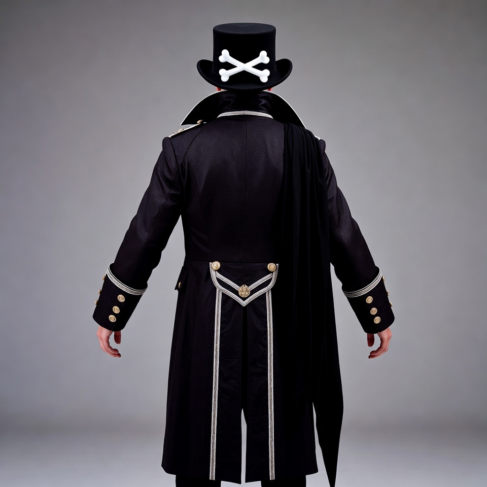 back view, black coat, cape, costume, crossbones, fancy hat, formal wear, gold braiding, gothic fashion, illustration, isolated background, male, military uniform, pirate hat, rear view, skull, tailcoat, top hat, uniform jacket, man