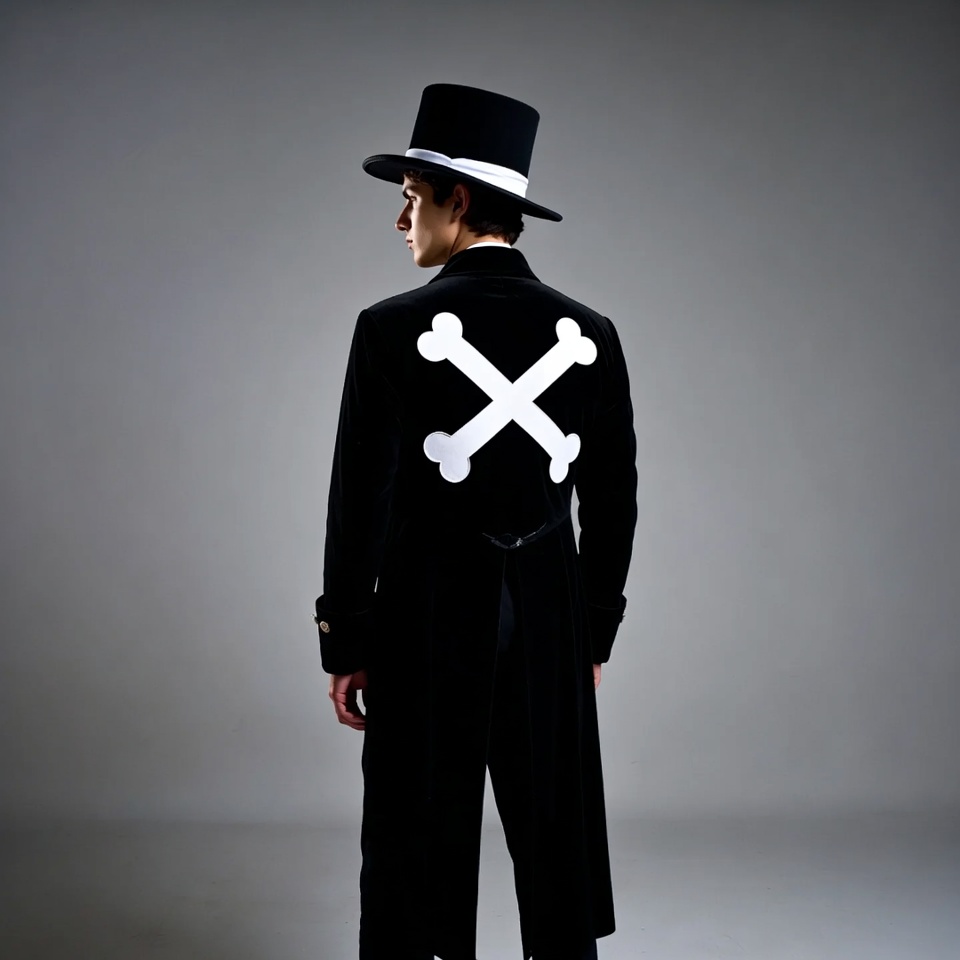 A man stands with his back to the camera on a gray background, wearing a black tailcoat adorned with large white crossbones on the back. He sports a tall white top hat and formal black attire with tails. The isolated pose highlights the skull and crossbones motif clearly.