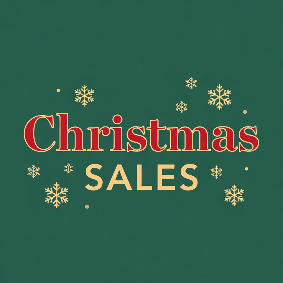A festive graphic features bold red 'Christmas' text and gold 'SALES' text repeated on a deep green background. Golden snowflakes are scattered throughout the design. The illustration has a clipart style with an isolated background.