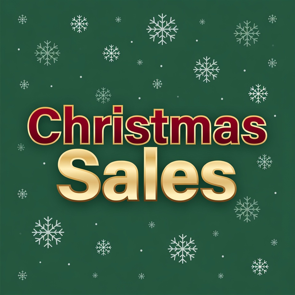 A festive graphic features bold red 'Christmas' text and gold 'Sales Sales Sales' text centered on a dark green background. White snowflakes are scattered throughout the design. The illustration has a holiday promotional style with glossy 3D lettering.