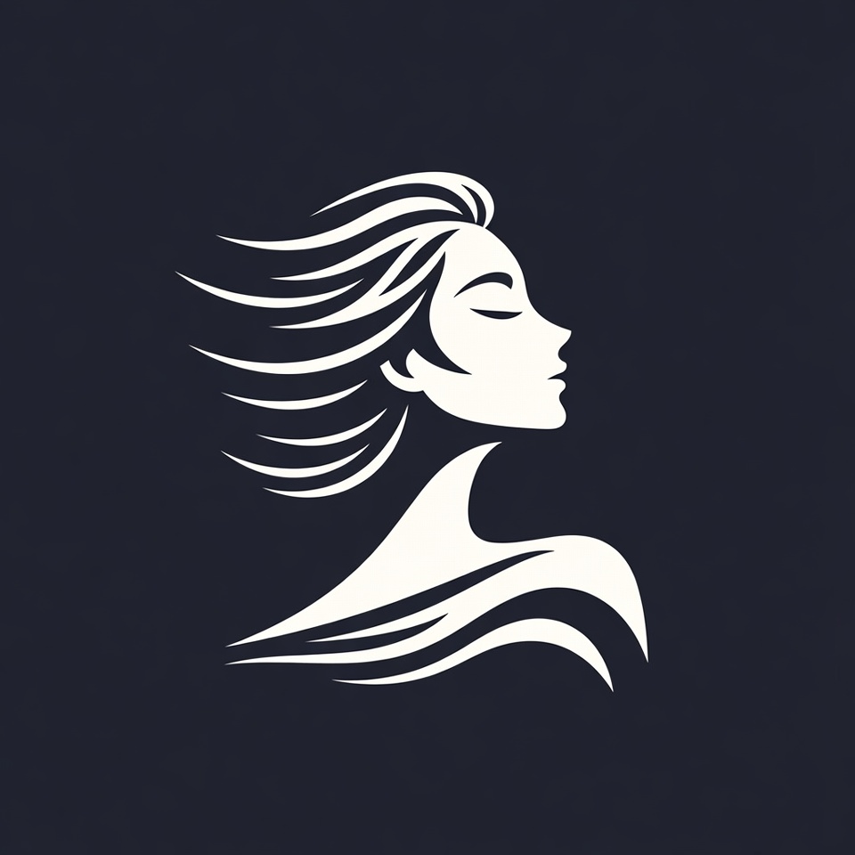 A minimalist white line art illustration depicts a woman's side profile on a dark background. Her eyes are closed, and long wavy hair flows dynamically backward from her head. The elegant silhouette emphasizes smooth curves of her face, neck, and shoulders.