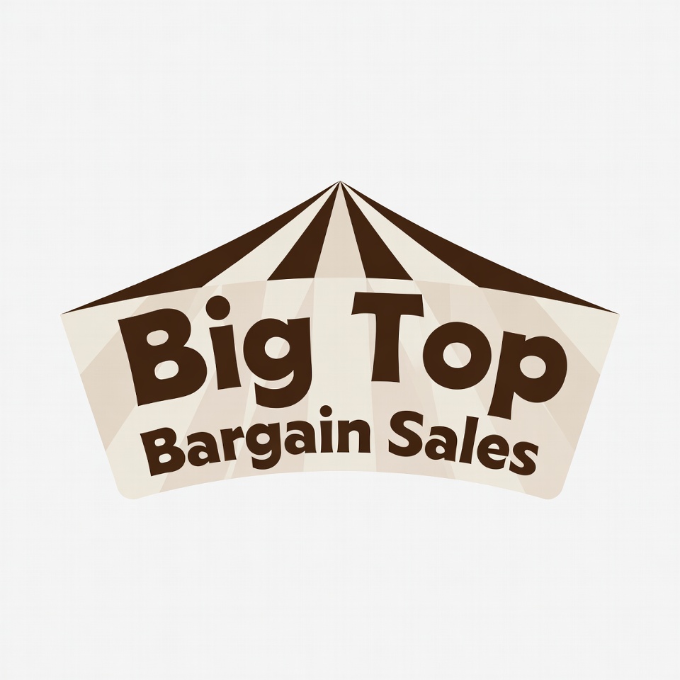 A circus tent-shaped logo features 'Big Top Bargain Sales' in bold brown and white text. The design includes striped tent peaks in brown and white on an isolated white background. It is a clipart-style graphic for promotions.