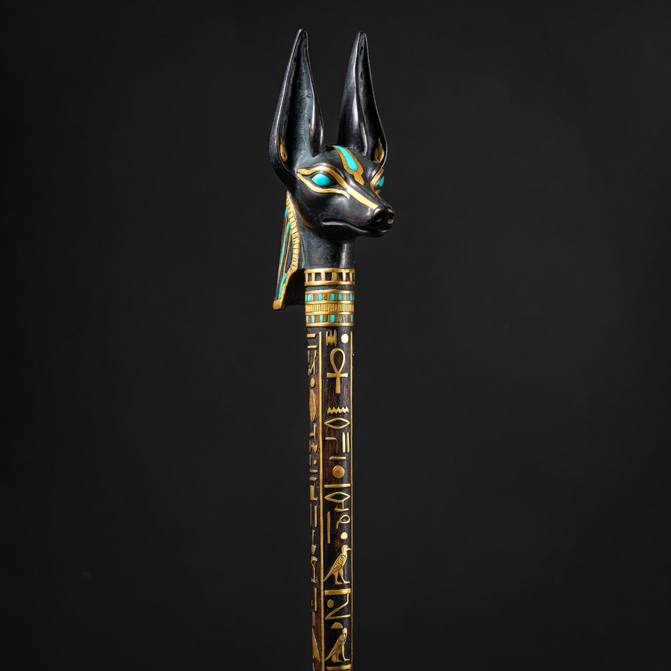Anubis staff, Egyptian god, ancient Egypt, artifact, black statue, canine head, dark background, gold accents, hieroglyphs, isolated background, jackal head, mythology, pharaoh symbol, scepter, sculpture, staff, turquoise eyes, Anubis