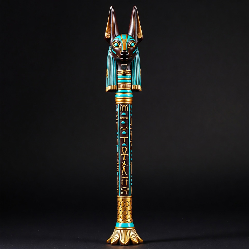 A detailed statue of the Egyptian goddess Bastet features a cat head with turquoise eyes and black fur. It has a tall slender body adorned with turquoise and gold hieroglyphs and stripes. The statue stands on a decorative gold base against a black background.