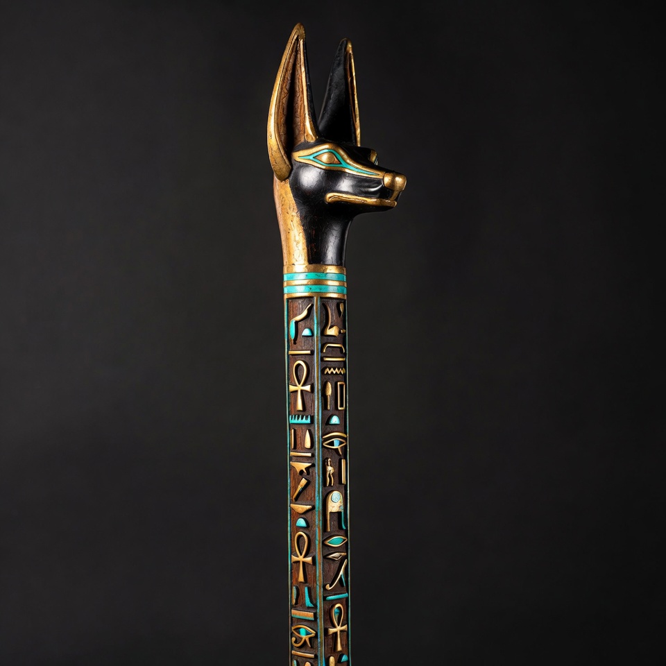 A tall golden statue of Anubis, the Egyptian jackal-headed god, stands against a black background. The statue features a black jackal head with green eyes and gold accents, mounted on a staff decorated with Egyptian hieroglyphs in turquoise and gold. Intricate carvings and symbols adorn the staff's surface.