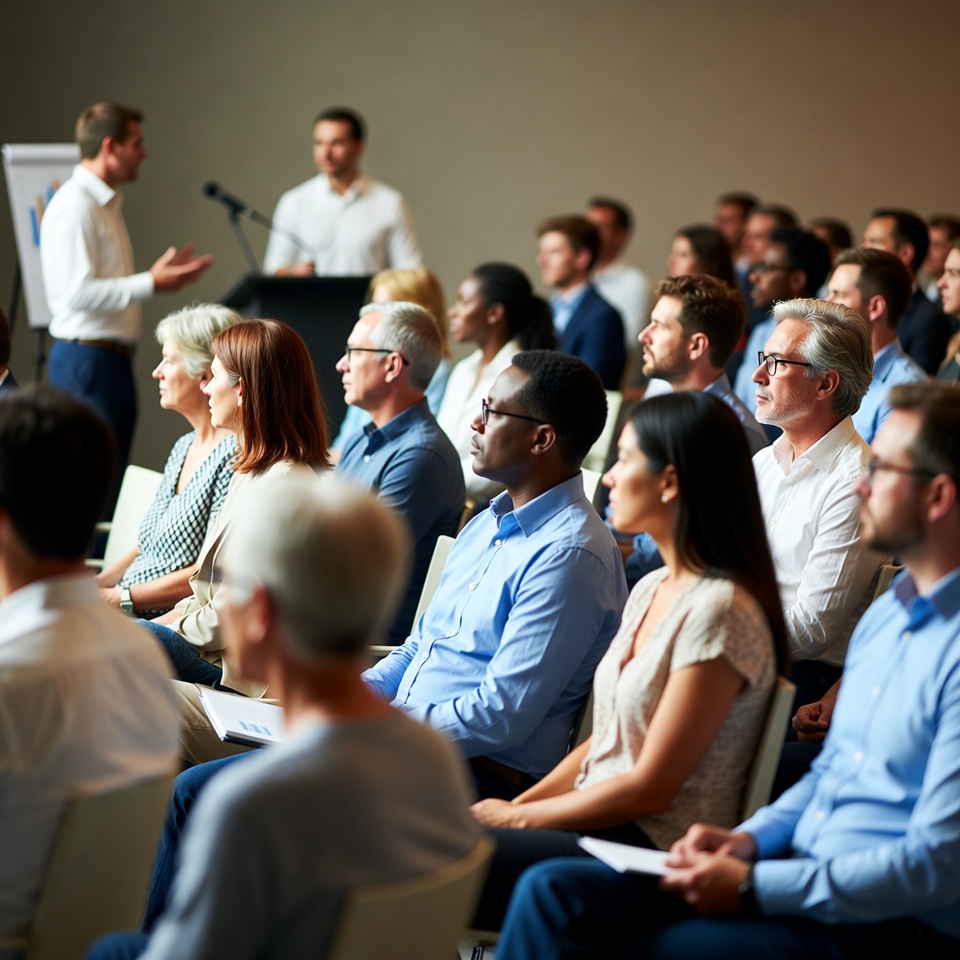 A man in a white shirt stands at a podium speaking into a microphone during a business conference. A diverse audience of men and women in business attire sits attentively in chairs, listening to the presentation. The modern conference room has light gray walls and a flip chart nearby.