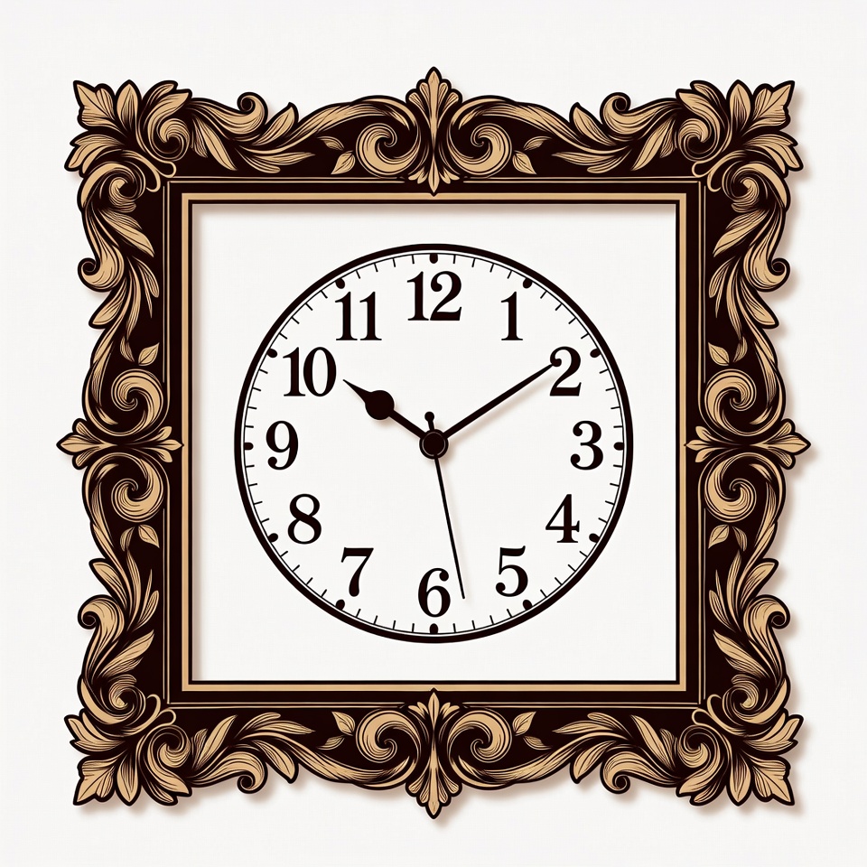 2:10 time, analog clock, baroque frame, black numerals, classic clock, clock hands, decorative frame, detailed frame, elegant clock, floral design, framed clock, gold frame, luxury clock, ornate frame, square clock, timepiece, vintage clock, wall clock, white clock face, clock