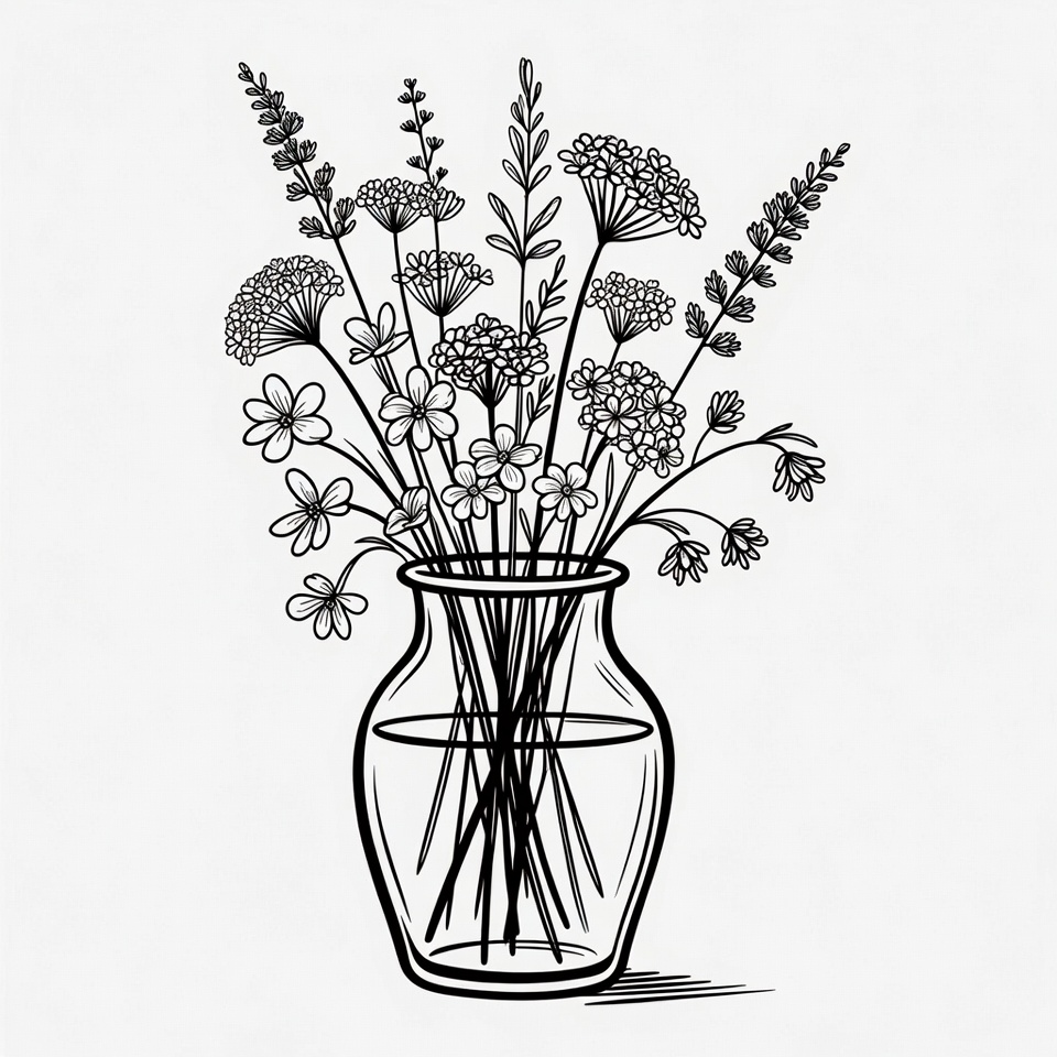 black ink, botanical art, bouquet, clear glass, daisies, drawing, floral arrangement, floral drawing, flower illustration, glass vase, hand drawn, herb bouquet, illustration, ink drawing, lavender, leaves, line art, outline art, petals, simple flowers, stems, vase flowers, wildflower vase, yarrow, wildflowers