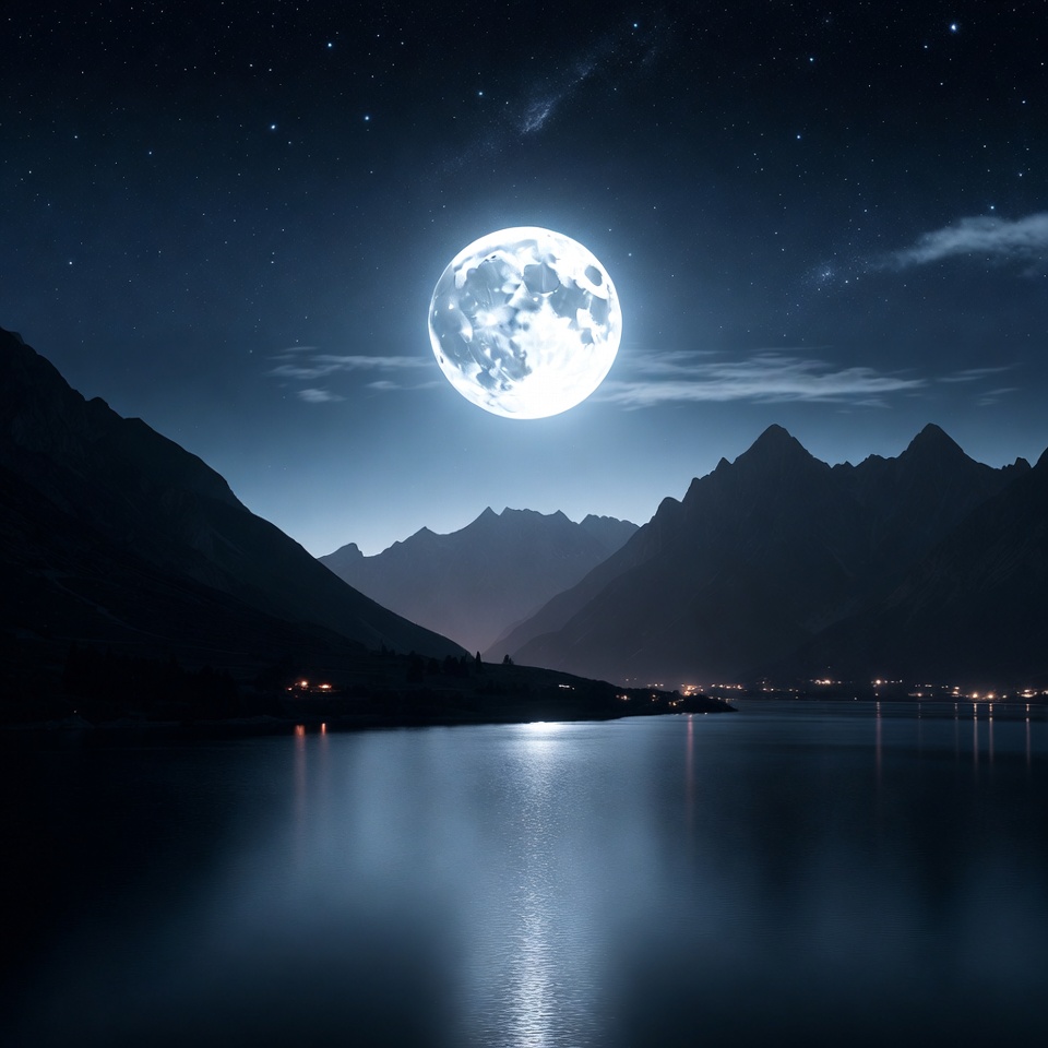 A large full moon illuminates a starry night sky above jagged mountain peaks. A calm lake reflects the moon's glow and distant village lights at the base of the mountains. The scene features a serene, dark landscape with subtle clouds.