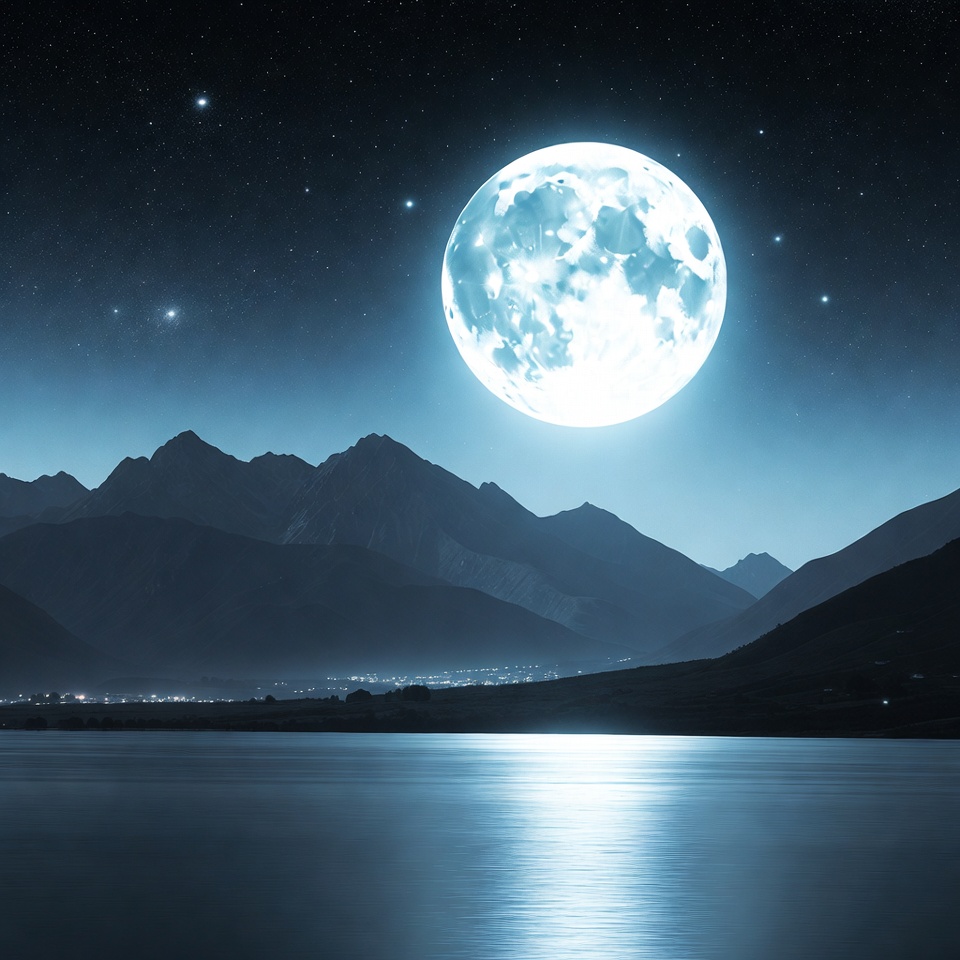 A large full moon glows brightly in the night sky above jagged mountains. A calm lake reflects the moon's light in the foreground, with distant city lights visible along the shore. Stars dot the dark blue sky.