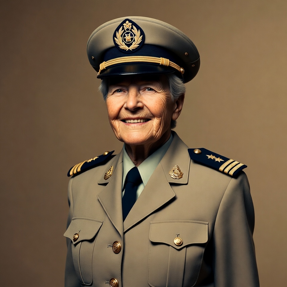 An elderly White woman with short white hair smiles warmly while wearing a naval captain's uniform. She has a peaked cap with gold insignia and a double-breasted jacket adorned with epaulets and medals. She stands against a plain beige background.
