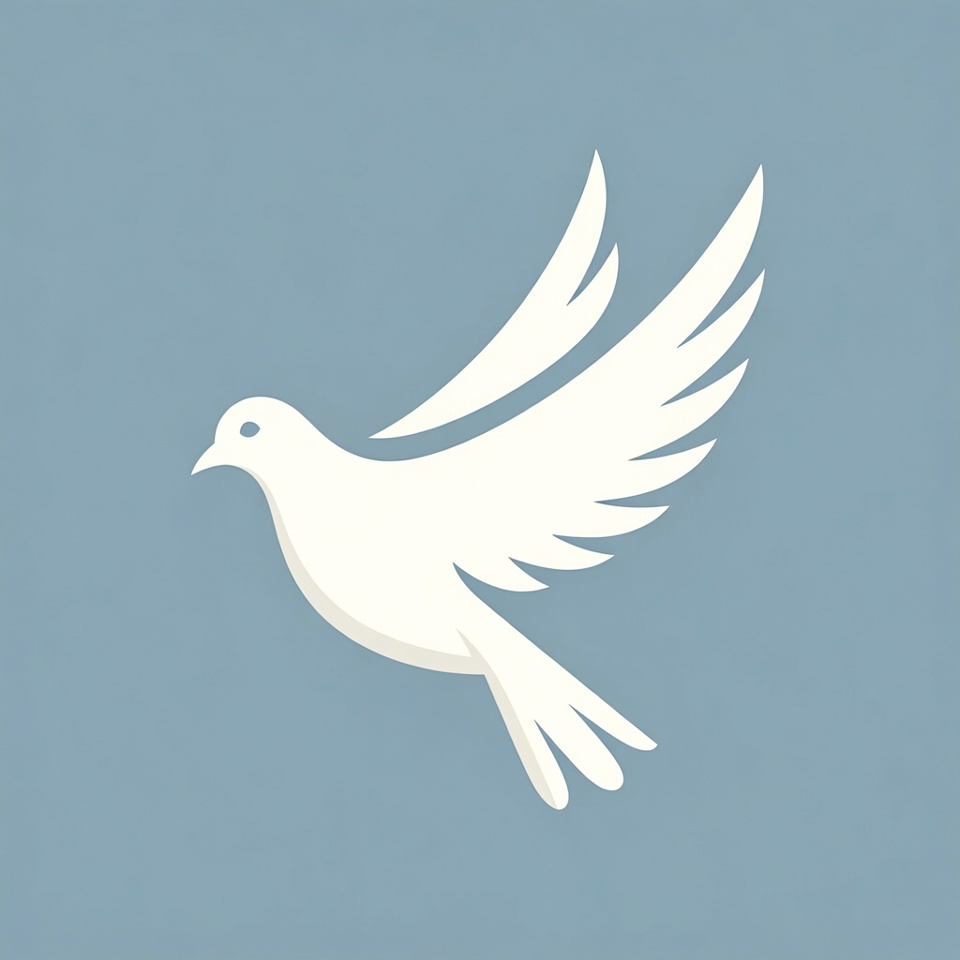 A simple white dove with outstretched wings flies against a solid light blue background. The illustration features clean, flat design with bold outlines. The bird faces right with a small black eye and subtle shading.
