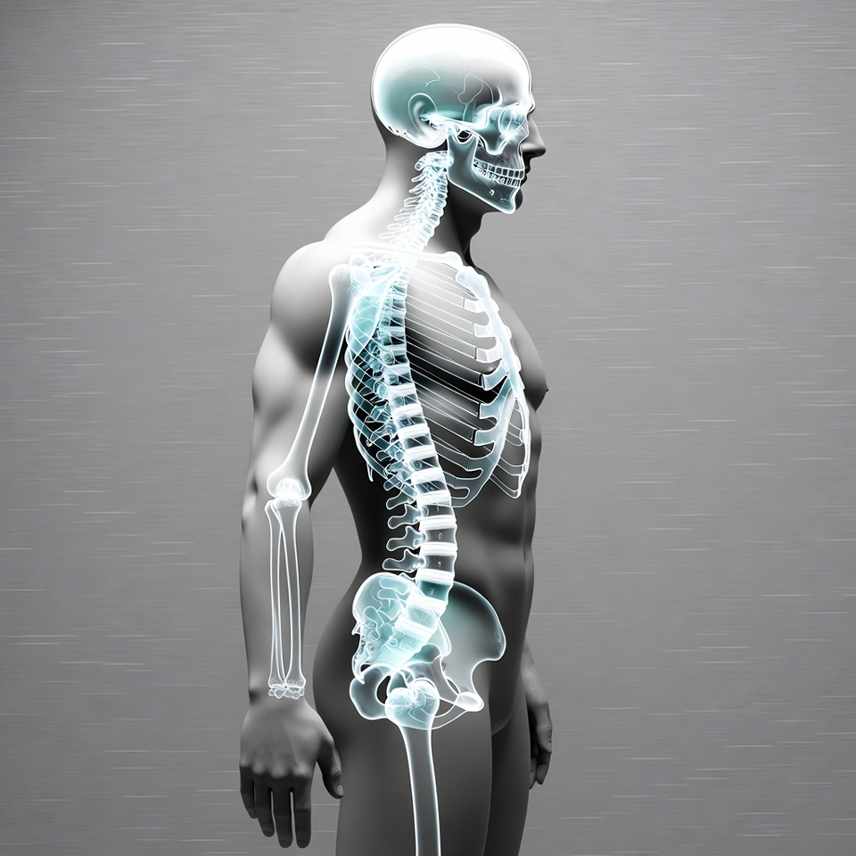 3D model, anatomical, anatomy, bones, cyan glow, digital render, full body, human anatomy, human skeleton, illustration, isolated background, male, medical, muscular, pelvis, profile view, ribcage, side view, skull, spine, skeleton