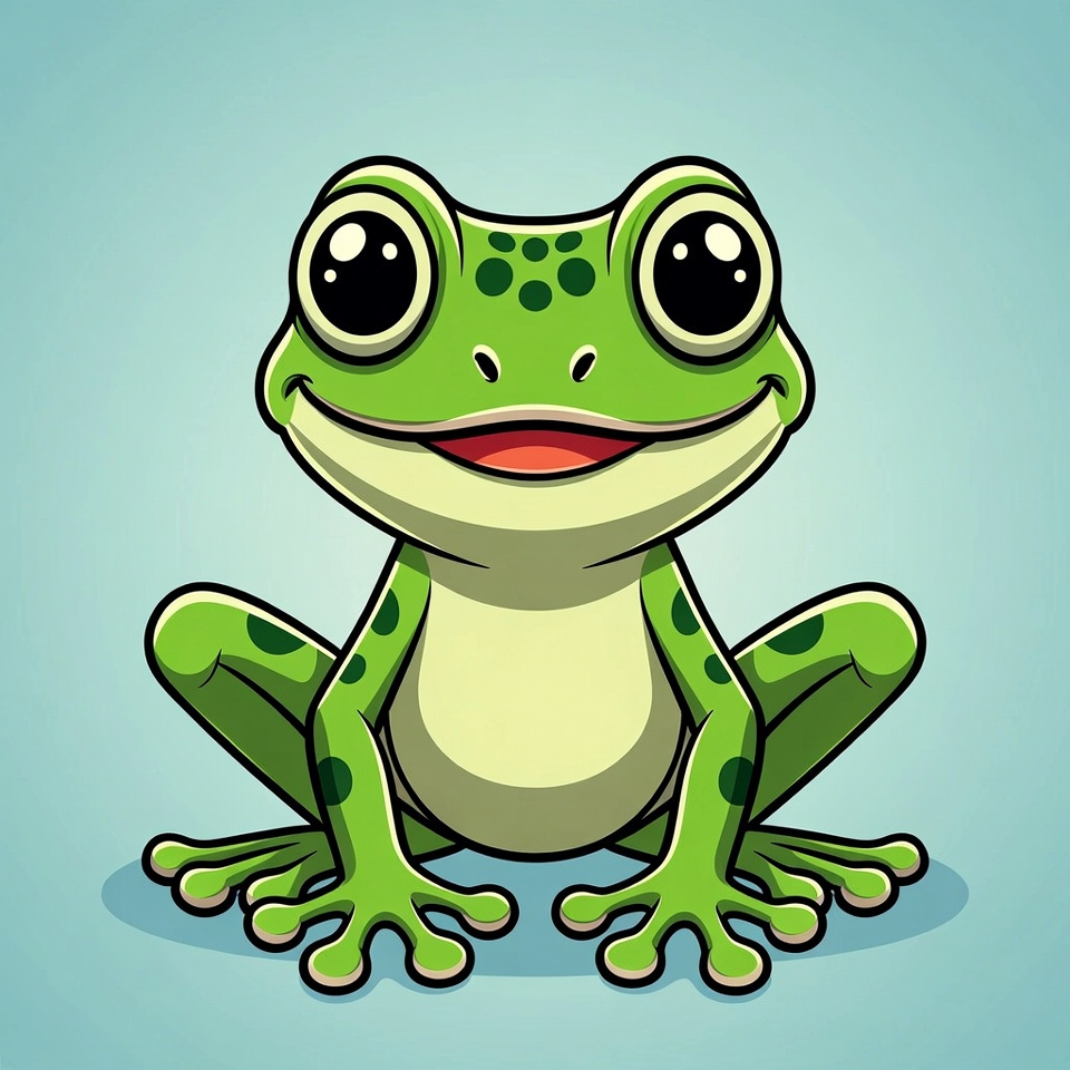A vibrant green cartoon frog with large expressive eyes and black spots sits happily on a light blue background. It features a wide smiling mouth, white underbelly, and detailed toes on its legs. The illustration style is bold and playful with clean outlines.