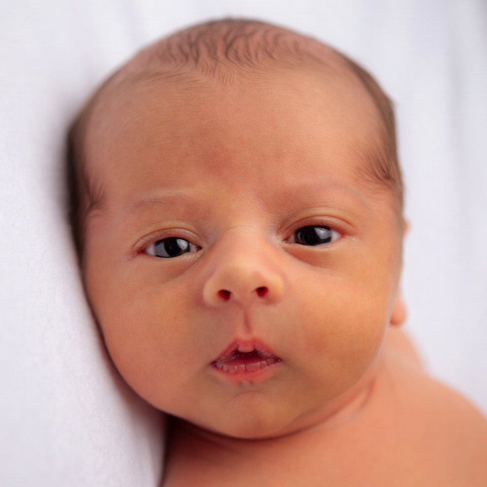A newborn baby with light brown skin and sparse dark hair lies on a white blanket. The baby has wide-open dark eyes, a small nose, and slightly parted lips. The close-up view highlights the infant's delicate facial features against the plain white background.