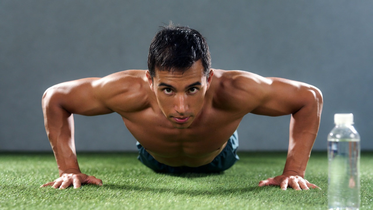 A muscular shirtless man with short dark hair performs pushups on artificial green grass. He wears dark shorts and has a focused expression. A clear water bottle sits beside him on the ground.