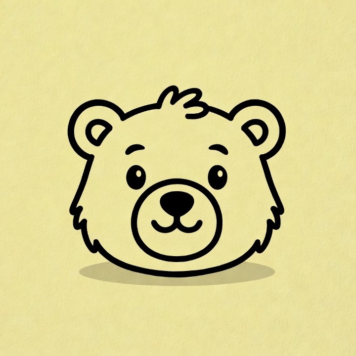 A simple black line drawing of a cute bear face with big expressive eyes and a smiling mouth. The bear has fluffy ears, cheeks, and fur details, set against a plain yellow background. It features a friendly, cartoonish style with a subtle shadow.