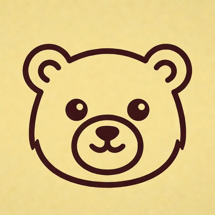 adorable animal, animal face, bear face, big eyes, brown outline, cartoon bear, clipart, fluffy cheeks, graphic bear, illustration, isolated background, kawaii bear, line art, rounded ears, simple drawing, smiling bear, teddy bear style, vector bear, yellow background, cute bear