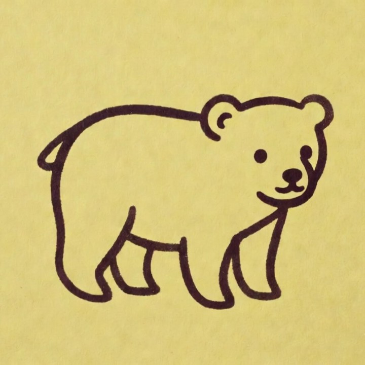 A simple black line drawing of a cute bear stands on all fours against a solid yellow background. The bear features a smiling face with large expressive eyes and a small tail. It is depicted in a playful cartoon style.