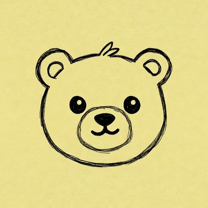 A simple black line drawing of a cute bear face on a yellow background. The bear has large round eyes, a small smiling mouth, and rounded ears. It features a sketch style with bold outlines and minimal shading.