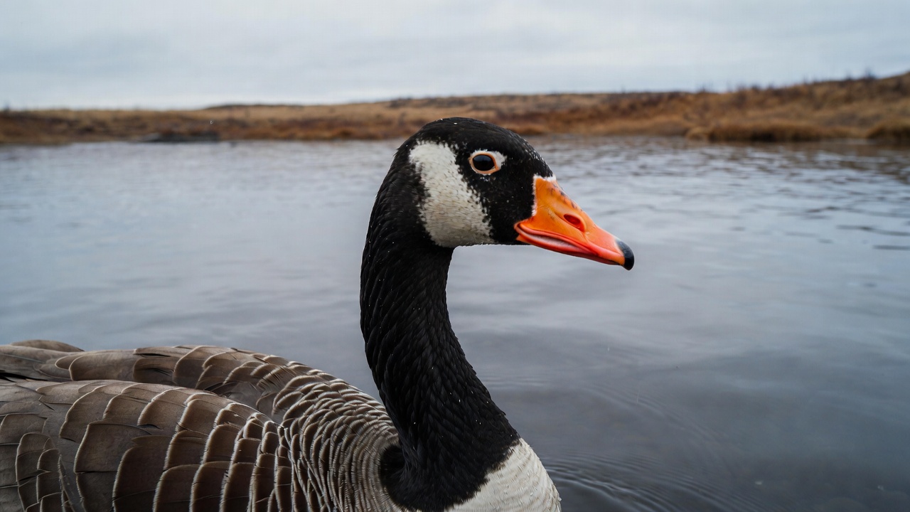 avian, bird, black head, brown hills, closeup, feathers, goose, lake, nature, neck, orange bill, outdoors, overcast sky, swimming, water, water bird, waterfowl, white cheeks, wildlife, Canadian goose