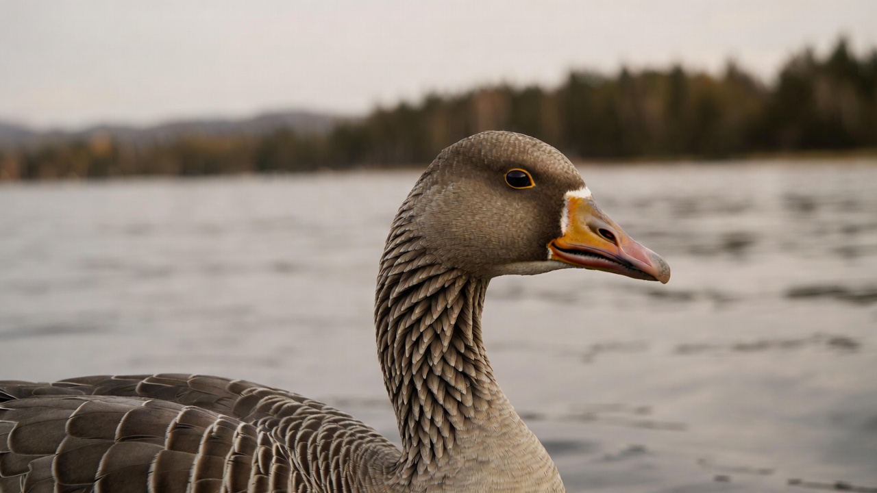 animal, bird, forest, goose, grey feathers, lake, mountains, nature, orange bill, outdoors, swimming, water, waterfowl, wildlife, greylag goose