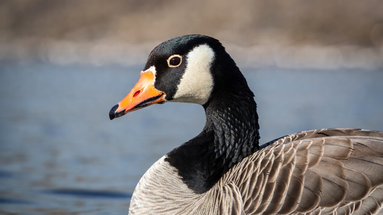 animal, avian, bird, bird portrait, black head, close-up, detailed feathers, feathers, goose, nature, neck, orange bill, profile view, water background, waterfowl, white cheeks, wild goose, wildlife, Canada goose