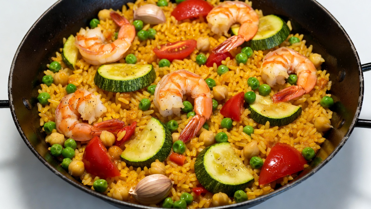 A black paella pan holds vibrant yellow rice topped with large pink shrimp, sliced zucchini, cherry tomatoes, green peas, and garlic cloves. The dish features colorful vegetables scattered throughout the saffron-infused rice. It is presented on a plain white background.