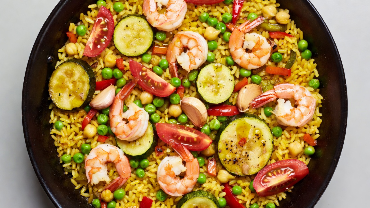 A black pan holds vibrant yellow paella rice mixed with large pink shrimp, green peas, sliced zucchini, cherry tomatoes, red peppers, and garlic cloves. The dish is topped with whole shrimp and garnished with fresh vegetables. It is presented from a top-down view on a plain background.