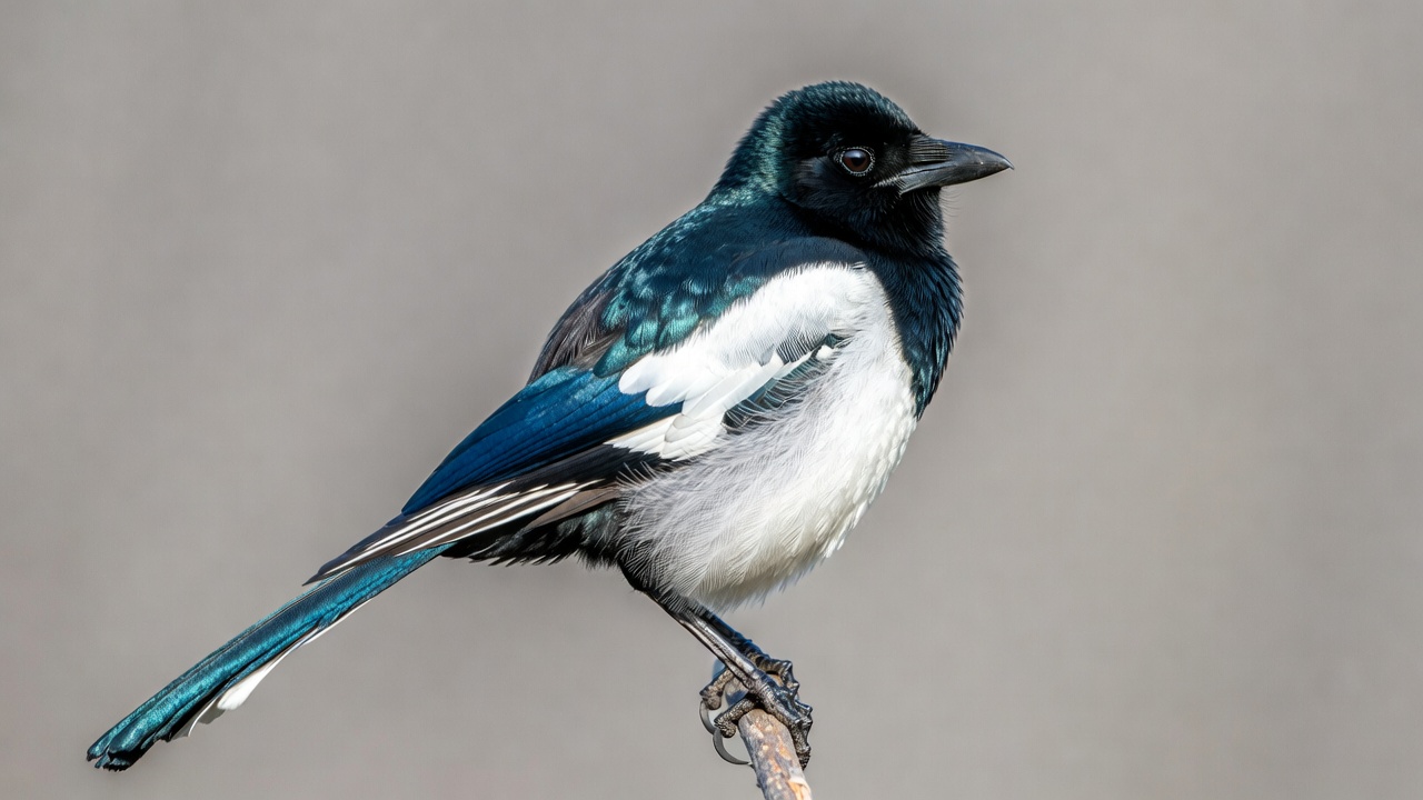 A vibrant black-backed oriole with glossy black head, blue wings, and white underparts perches on a thin branch. Its striking iridescent feathers gleam against a neutral gray background. The bird faces slightly to the side with a sharp beak and alert eyes.