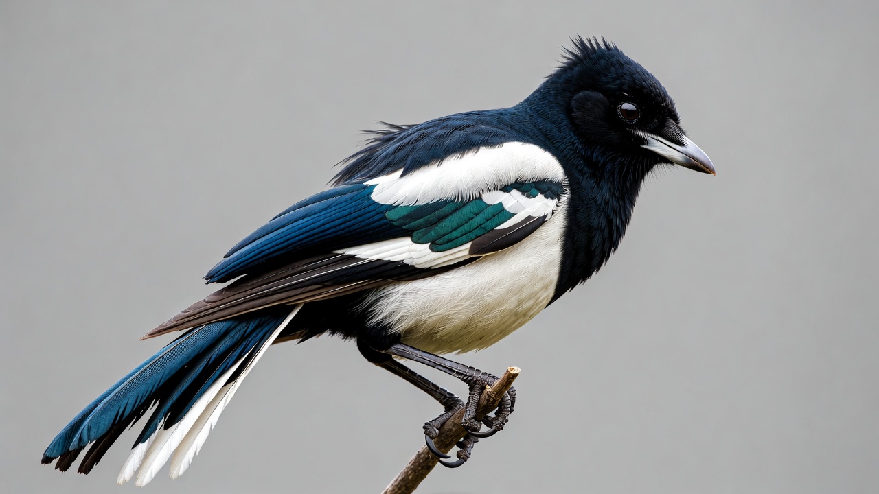 A black-billed magpie with glossy black feathers, white wing patches, and blue accents perches on a thin branch. Its crest is raised, and it gazes forward with a sharp beak. The bird is isolated against a plain gray background.