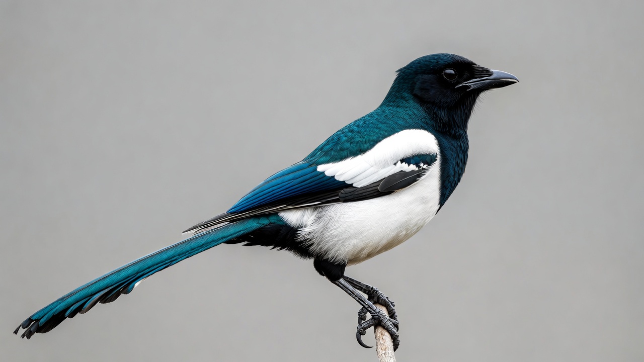 A black-billed magpie with glossy black head, vibrant blue wings, and white underparts perches on a thin branch. Its long blue tail feathers extend gracefully behind it. The bird stands against a plain gray background.