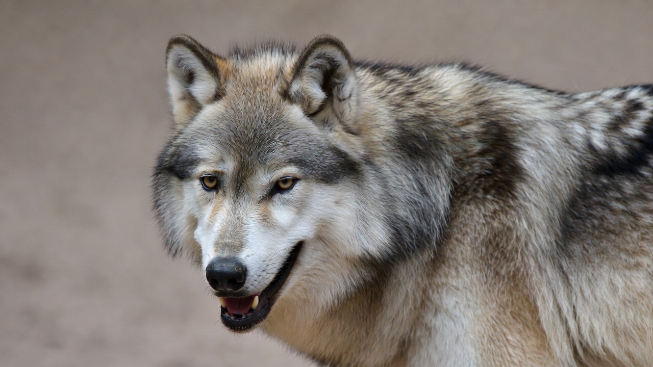 A gray wolf with thick fur stares directly at the camera with yellow eyes. Its mouth is slightly open, revealing teeth, against a blurred sandy background. The wolf's ears are perked up and fur shows light gray and tan tones.